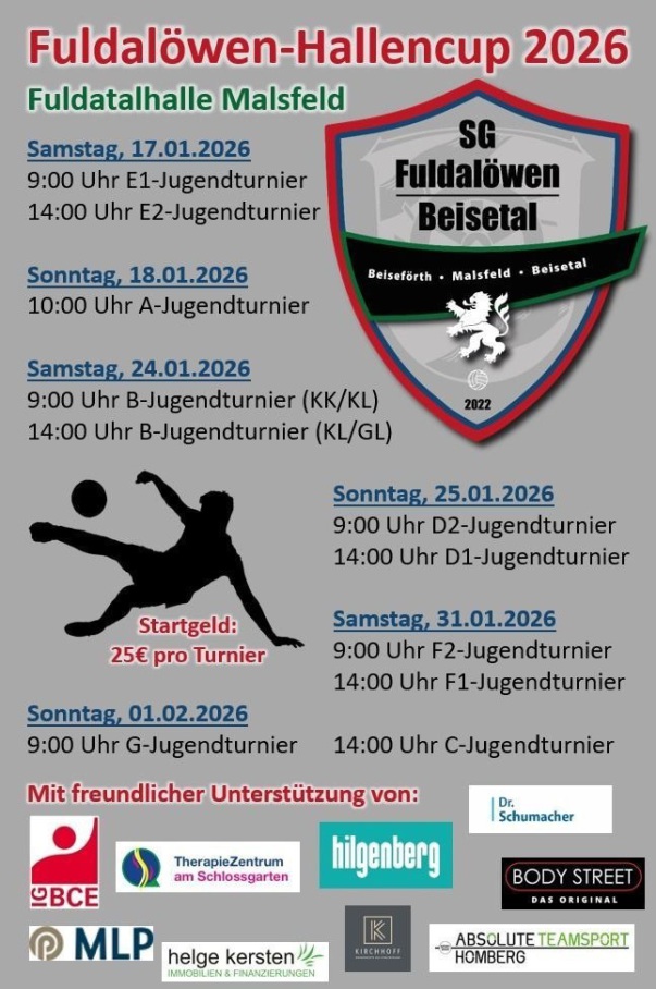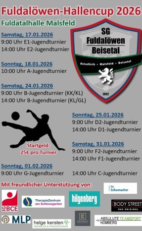 Mit vier spannenden Wettbewerben, begeisterten Teams und fairer Atmosphäre setzt der Fuldalöwen-Hallencup seine Erfolgsgeschichte fort – ein starkes Zeichen für den Jugendfußball in der Region. Am kommenden Wochenende geht es in die letzte Runde der diesjährigen Turnierserie. Den Start machen die F-Junioren (31.01.). Der letzte Turniertag (01.02.) beginnt am Vormittag mit einem Fußball-Festival der Bambinis gefolgt von den C-Junioren am Nachmittag.