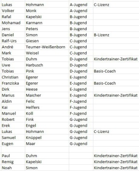 Mannschaften/ Trainer mit Telefonnummeren/ Trainingszeiten/Trainingsorte.